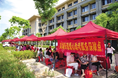 志愿者搭建休息凉篷给送考家长在校外等候。 ■ 记者 周诚