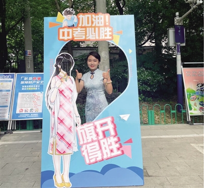 6月14日上午,2022年中考开考。包河区烟墩街道滨湖明珠社区开展护航中考志愿服务活动。现场,社区设置了中考加油祝福牌,家长们留影纪念,并为考生加油打气。同时,青年志愿者、五老志愿者积极提供免费饮用水发放、维护秩序等服务。 ■ 胡蕾 记者 沈娟娟