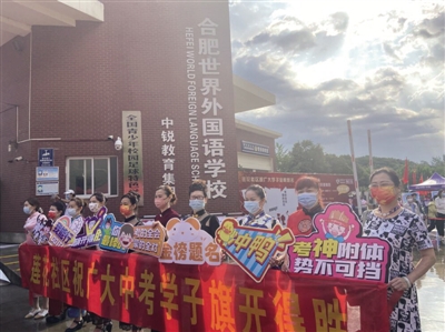 6月14日上午,在合肥经开区莲花社区合肥世界外国语学校门口,考生们满载希望与嘱托,迈着自信的步伐走进考场。在入场通道旁,一群身穿旗袍的送考阿姨们边挥着手里的加油牌,边向他们送上祝福,她们都是莲花社区朝霞居民区党委招募的党员志愿者。“我的孩子去年参加高考的,现在去了外地上大学,前几天在群里看到招募爱心护考志愿者就报名参加了,今天为了孩子们再次