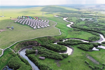 时下,内蒙古自治区呼伦贝尔草原披上新绿,景色优美。图为日前拍摄的呼伦贝尔草原景色(无人机照片)。