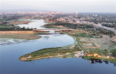 位于毛乌素沙地南缘的陕西省榆林市靖边县城,有一条穿城而过的芦河,它是陕北农业生产的重要水源,昔日由于水土流失,环境污染严重。近年来,当地政府采取有力措施,不断加大对芦河治理和水环境保护力度,如今芦河已变成一道水清岸绿、鸟语花香的美丽风景线。图为6月20日,朝霞照耀在宽阔清澈的芦河河面,远处是靖边县城。 ■ 新华社记者 陶明/摄