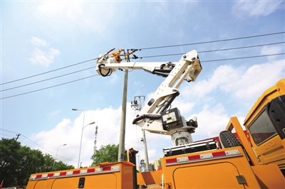 连日来高温持续,合肥电网已全面进入迎峰度夏阶段,电网最大负荷连破纪录。为了确保炎炎夏日里广大市民安心清凉用电,国网合肥供电公司配网运营中心不停电作业班的员工们24小时待命,不分白天黑夜在城市里忙碌穿梭,进行各项带电作业工作任务。图为工作人员在高空有序作业。