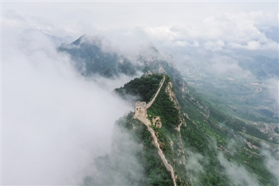 7月4日,大雨过后,位于北京市密云区和河北省滦平县交界处附近的长城云雾缭绕,如同水墨画一般。 图为云雾中的长城望京楼(无人机照片)。 ■ 新华社记者 陈晔华/摄