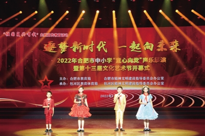 星报讯 7月8日上午,合肥市教育局、市文明办联合举办“逐梦新时代,一起向未来”——2022年合肥市中小学“童心向党”声乐展演暨第十三届文化艺术节开幕式活动,36所中小学、近2000名学生齐聚包河凤凰剧院参与现场展演。