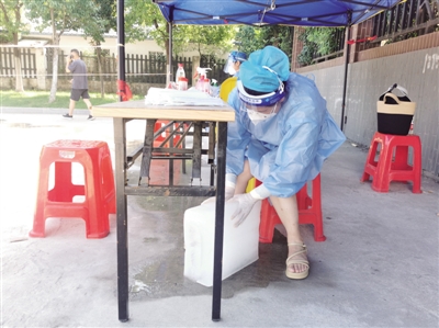 合肥市包河区包河苑中心广场核酸采样点虽然佩戴着挂脖式便携风扇,但刚刚开始工作的采样人员汗水还是顺着发梢滴了下来。在包河区政协委员袁驾和夏春龙的组织动员及多方协调下,政协委员们为骆岗街道送来14400斤冰块,为医务人员送来一丝凉意。