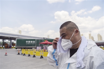 1 7月13日中午,在合肥绕城高速蜀山道口参加值守工作的西园街道工作人员在轮休时擦拭脸上的汗水。 ■ 黄洋洋