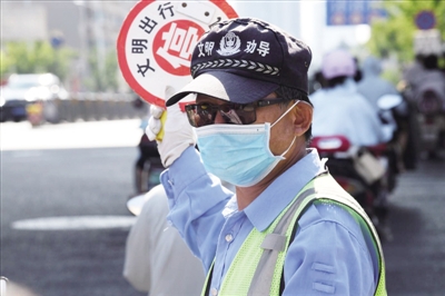 3 7月13日,在合肥清溪路与西一环交叉口,蜀山区文明交通劝导员朱红兵在高温下坚守工作岗位,协助交警维持交口交通秩序。 ■ 孙雨静 沈娟娟