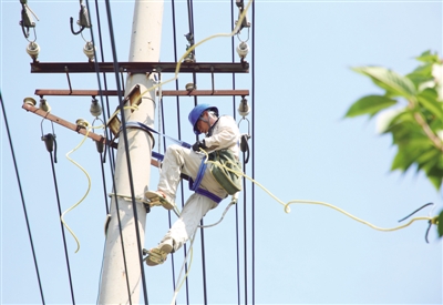 7月13日上午11点,在合肥市庐阳区合瓦路和临泉路交叉口附近,国网合肥供电公司庐阳供电服务中心员工正在电杆上的10米高空中进行电力线路的消缺和升级作业。现场可以看到,工人师傅们相互配合,按照步骤分别将原先位于电力杆线上、居民楼一侧的老旧电力线路和设备进行拆除。高空电杆上的师傅熟练地使用绳索接过电动工器具,进行新设备和线路安装和固定……