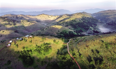 盛夏时节,陕西省安康市岚皋县巴山大草原野花遍地,风光旖旎,吸引众多游客到此露营度夏休闲。近年来,当地政府依托巴山大草原高品质草原观光、帐篷露营等多样化旅游产品,提升旅游品牌,实现旅游产业跨越式发展。图为朝霞照耀着巴山大草原。 ■ 新华社记者 陶明/摄