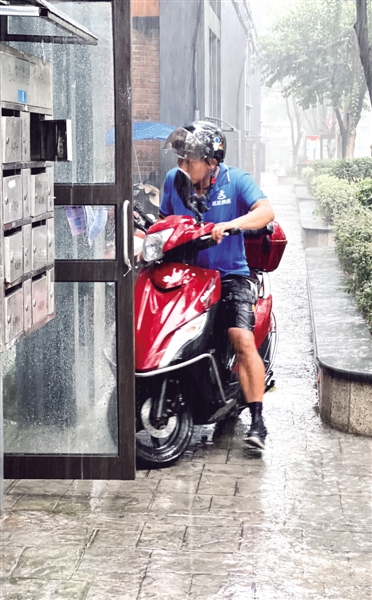 1 7月20日,合肥老城区突降大雨,一位快递小哥被淋得浑身湿透,仍在冒雨投送。 ■ 祝亮