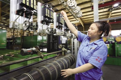 6 7月18日,一位女工冒着高温正在合肥庐阳经济开发区星辰电缆股份有限公司调试漆包线加工生产设备。 ■ 韩婷婷