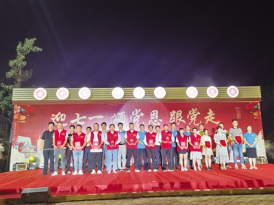 7月的青墩,格外鲜红; 7月的颂歌,格外嘹亮。2022年七一建党节前夕,在碧桂园舒城县乡村振兴工作队的协助下,舒城县青墩村第三次举办了庆七一“青墩村晚”。其中,一篇主题为《青墩大美,因为有你》的诗歌朗诵,在青墩夜的上空,久久传唱。青墩百姓用散文诗的语言,声情并茂地向在场的观众们,讲述了青墩村这些年蝶变巨变、繁荣发展背后的人和事儿。他们中有李小松、汪成根等一批实现脱贫奔小康的青墩百姓;有黎超新、刘永超等扎根一线开展乡村振兴工作的代表;有疫情防控点上的青年党员,有生活在青墩几十年的老支书……