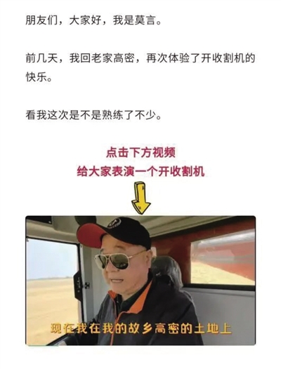前段时间,作家莫言在社交平台晒出了一段戴着墨镜“飙”收割机的视频,并配文“再次体验了开收割机的快乐”。有网友调侃:“有朝一日居然能看到诺贝尔文学奖得主飙收割机,我和我的小伙伴都惊呆了。”的确,在不少人的印象中,著书立说的文坛巨匠们或严肃沉稳,或敏感忧郁,或儒雅宽和,带着知识分子特有的自矜,似乎哪一点都和视频里这个陶然忘忧的“田舍翁”不沾边。现实则恰恰相反,许多文人不仅不刻板不苦大仇深,私下里还有我们不知道的另一面。