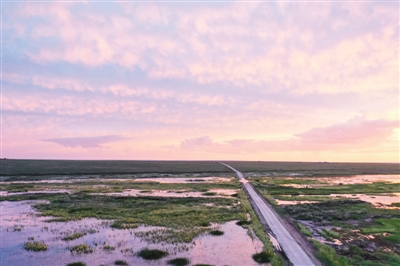 夏日,内蒙古锡林郭勒草原一碧千里,牛羊散落其中,河流蜿蜒曲折,景色宜人。图为在内蒙古东乌珠穆沁旗拍摄的夕阳下的草原。 新华社记者 刘磊/摄