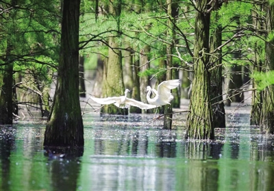 水中有林,林中有鸟,湖上有莲,小舟载着赏景的游客静静划过。上万株池杉耸立在碧波荡漾的湖水中,成千上万只鸟儿在其间筑巢、嬉戏……