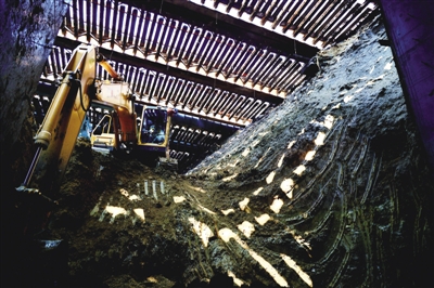 步入其中一孔箱涵顶进现场,该箱涵高度约13米,有4层楼高,长99米,在千斤顶“大力士”的推动下,箱涵“巨无霸”徐徐往前移动。