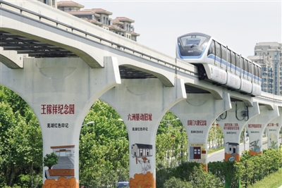安徽芜湖轨道交通二号线神山公园站,单轨列车轨道下的墩柱上呈现当地“红色印记”主题彩绘。从渡江第一船到王稼祥纪念园,墩柱上的一幅幅彩绘吸引着周边市民驻足观赏。“红色记忆”主题彩绘不仅让革命遗址“活”了起来,也让红色文化“亮”了起来,成为城市的一道新风景。