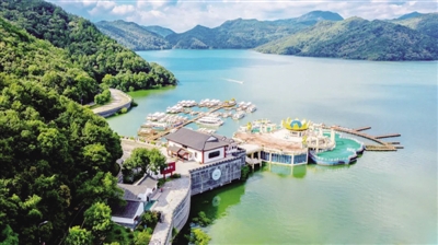 朦胧的烟雨笼罩着水面,天青色的水面清澈见底。梅雨时节的花亭湖,四周山峦起伏,怪石嶙峋,果木葱茏,茶园翠绿。著名社会活动家、杰出的爱国宗教领袖赵朴初先生1990年回乡游湖,写下“神驰远景无疆,仅尽情领受,千重山色,万顷波光”。