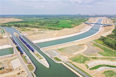安徽合肥,航拍建设中的引江济淮工程。世界上单跨最大的钢结构通水通航渡槽——引江济淮淠河总干渠钢渡槽在引江济淮渠道上凌空而过,颇为壮观。该渡槽总长350米,其中钢渡槽长246米,比引江济淮河道高出30多米,形成了河上有河,可通水行船的“水桥”。引江济淮工程是国务院要求加快建设的172项重大节水供水工程之一,也是安徽省基础设施建设“一号工程”。眼下建设者们正加紧施工,力争年底水道全线试通水通航。