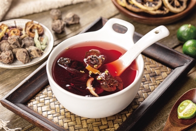 制作:取乌梅30g、干山楂30g、陈皮10g、甘草5g倒入锅中,加适量水浸泡15分钟,大火煮开后改小火继续煎煮30分钟,关火前3分钟加入桂花,最后加入冰糖(依据个人口味添加)调味即可。