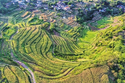 时下,重庆市北碚区三圣镇是平村的水稻、高粱等农作物相继进入成熟期。稻田、高粱地、玉米地、民居等相映成趣,美如画卷。 图为8月16日拍摄的重庆市北碚区三圣镇是平村景象。 新华社记者 王全超/摄
