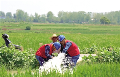 8月18日,在合肥市高刘镇青山村,国网安徽电力皖美共产党员服务队合肥分队队员协助当地村民架设水泵,从临近水渠引水浇灌良田。面对旱情,合肥供电公司进一步增加人员力量,24小时保障各乡镇电灌站、水利设施的供电安全平稳,根据农民需求,将引水所需的电力一直送到田间地头,全力保障秋粮丰收。 李岩