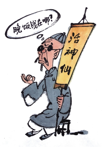 我上下班都要经过一个街心花园。这里有两三个常驻的算命先生。他们每天穿着道袍,戴着道帽,摆着小板凳、竹筒子和纸牌子,有模有样的。朝九晚五,按时“上下班”,少有缺席。每有行人路过,总是热情地招揽生意:“来,算一卦,卜凶吉、算未来,趋吉避祸,不准不要钱!”