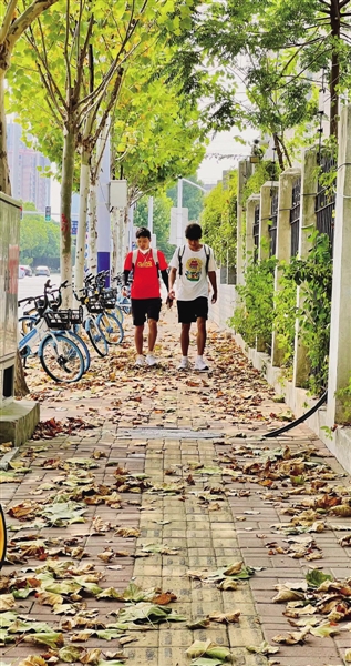 4 今年夏季,高温热浪肆虐江淮大地,很多树木为了减少水分流失,开启落叶自保模式。图为合肥市黄山路两侧的梧桐树落叶撒满人行道,宛如深秋。 祝亮