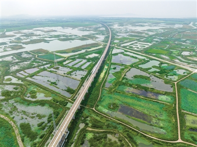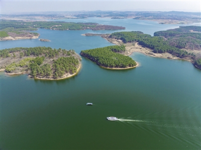在肥东县十八联圩湿地内的南淝河河段,一艘艘运输船在河面上驶过,忙碌的景象和周边的绿水蓝天相得益彰。