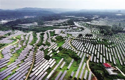 2021年底,随着陕西洛南100兆瓦光伏农业与观光旅游综合利用示范项目并网,昔日商洛市洛南县2800亩的一片坡塬,变成了农光互补的新能源基地。该每年为项目所在地4个村分红,并提供农业启动金,打造种植示范区,修建旅游观光台,形成“地上发电、地面农业、厂区观光”的三产融合模式。 图为日前拍摄的陕西洛南的“光伏农场”。