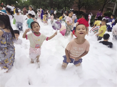 日前,合肥市新站高新区刘大郢社居委、安泰社工联合康桥学校在合郢花园小区广场开展了“暑期趣味泡泡趴”主题活动。孩子们兴致高涨,一个个带着自己的“作战工具”参与到水枪大战、躲避水球等环节中,在白色泡沫中你追我赶,尽情嬉戏玩耍,幸福的笑容绽放在每个孩子的脸上。