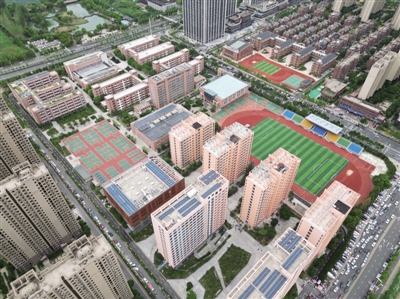 校园东区,男女生宿舍楼每层均配备多个公共卫生间、近百个淋浴喷头,综合服务楼位于男女生住宿区之间,内有便利超市、面包房、休息吧等。校园西区,每栋教学楼设有教师办公室、智慧图书室、学生服务间、录播教室、多功能教室、实验室以及共享学习空间。