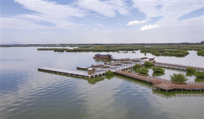 初秋时节,位于宁夏银川市以北42公里处的石嘴山市平罗县境内的沙湖景区处处呈现沙水相依、碧波万顷的美丽画卷。据悉,沙湖景区总面积80.1平方公里,其中湖泊面积45平方公里,沙漠面积22.5平方公里。图为8月28日拍摄的宁夏沙湖景区(无人机照片)。