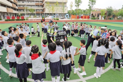 4 8月31日,在合肥市徽州小学美丹校区的校园内,公安交警正在与孩子们一起开展“开学第一课”交通安全宣传教育活动。 合肥交警