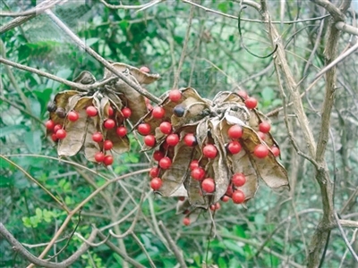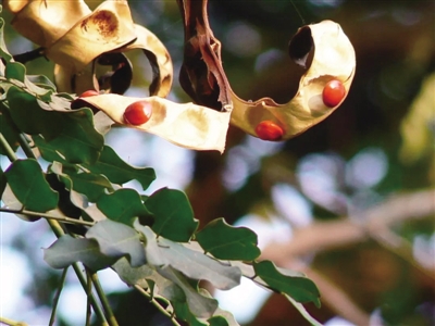海红豆是一种落叶小乔木,是红豆树的一种,在我国常见于岭南地区。海红豆的种子稍扁,有点像心型,种子呈现鲜红色,也有相思之意。海红豆果实坚硬,可以做成饰品。因为果实比较坚硬不易腐烂,也被用来象征忠贞不渝的爱情。