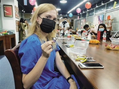 9月7日,8位来自中国科学技术大学国际学院的外国留学生,在合肥市蜀山区文化馆“组团”体验非遗,感受中秋“节味”。在非遗老师的带领下,留学生们首先体验了弹古琴,感受传统非遗文化的魅力。随后,在体验制作“玉兔”盘扣胸针的过程中,留学生们不约而同发出惊叹声,在非遗老师的指导下,大家用金属丝、布条、彩线等简单的材料便制作出栩栩如生的“玉兔”盘扣胸针。来自巴基斯坦的留学生Warda(中文名瓦拉)激动地告诉记者,自己第一次见识古琴和盘扣,“感觉非常有意思,我很喜欢中国传统文化,以后如果有类似的活动,我还想来参加。”