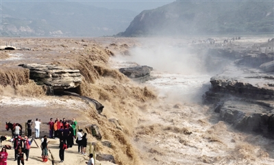 近日,秦晋交界的黄河壶口瀑布水量大增,形成绵延数百米的壮美瀑布群。图为9月15日,游人在黄河壶口瀑布游览(无人机照片)。
