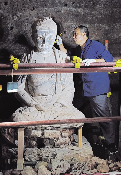 目前正在修复的是东室第7龛主佛,莲台的莲瓣碎裂成多块,莲台下的须弥座变形失稳。如果不修复,不出几年,主尊宋代佛像就会坍塌。