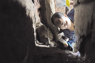 在做坛基内部加固前,需要先清理倒凹字形坛基内部的杂物,因为坛基较低,牟常有需要侧卧在地伸长脖子,借助LED照明灯和手电筒共同的亮光才能看清里面,然后一点点往外清。牟常有在修复现场会不断去发现古代工匠的手艺、方法,甚至他们的生活,人的信息最关键,避免了很多考古信息的遗失。