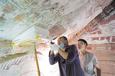 在别人看来,牟常有的人生就是一块块泥土拼接起来的,单一且辛苦。但在牟常有看来,这更是一种享受。泥塑、壁画里蕴藏着深厚的历史文化和审美趣味。自2001年开始独立修复洞窟后,牟常有首先修复的是第70窟顶高、面阔都是一米多的小型龛。“当时整个龛的壁画都快从崖壁上脱落,用锚杆挂麻压泥,花了一年时间把它们贴了回去。”