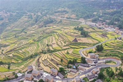 地处武陵山区腹地的重庆市酉阳土家族苗族自治县花田乡,是远近驰名的万亩梯田贡米之乡。秋收时节,金黄色的水稻铺满山坡,稻农们利用晴好天气抢收稻谷,呈现出一派美丽的丰收画卷。图为日前拍摄的酉阳土家族苗族自治县花田乡的梯田(无人机照片)。 新华社记者 唐奕/摄