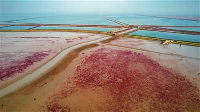 近日,在山东黄河三角洲国家级自然保护区,翅碱蓬给滨海滩涂湿地铺上“红地毯”,成为秋季黄河口独特的风景。近年来,保护区坚持以生态的办法治理生态,实施湿地修复项目,达到“一次修复、自然演替、长期稳定”的良好湿地修复效果。图为9月18日在山东黄河三角洲国家级自然保护区拍摄的湿地景色。