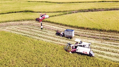 伴随隆隆的机器声,一台台收割机在田间来回穿梭,黄灿灿的稻穗“钻入”机器,饱满的谷子颗粒归仓,在集中成片的田间堆积成一座座“金山”。“单产突破1200斤,亩均效益可增加200元。”说起今年收成,刚刚被评为全市乡村振兴带头人的潘作军一脸喜悦。