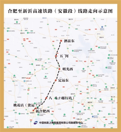 合肥至新沂高速铁路(安徽段)起自合肥市,途经滁州市定远县、明光市、蚌埠市五河县、宿州市泗县后进入江苏境内。线路共设泗县东、五河、明光西、定远东、八斗、桃花店、新合肥西等7个车站。