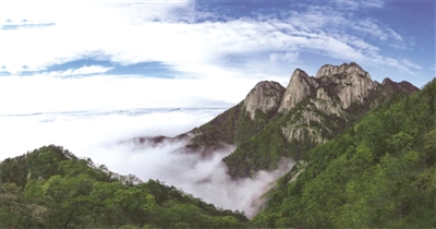 乘缆车,直奔主峰——天子峰。从缆车上望下去,山谷奇松错落,峡谷幽深,清溪潺潺,一派勃发生机。心醉神迷之际,突然看见山谷中雪浪翻滚,雾气从山间盆地抬升,云海大面积集结,在微风作用下,时而上升,时而下坠,飘飘荡荡,回旋舒展,仿佛要带来一场即将上演的大戏,气象万千,气势如虹。云气追逐着缆车,顺着山坡,漫过松林,一路向上攀升。