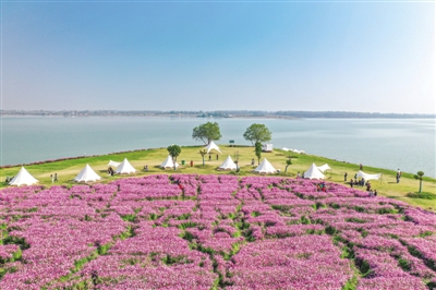11月7日,游客在安徽省合肥市肥东县梁园镇护城社区格桑花海内游玩(无人机照片)。