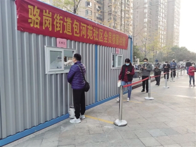 居民刘先生正在接受核酸检测,测温、扫码、张嘴、检测,消毒、采集、留存,整个过程有条不紊地进行。
