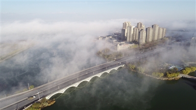 11月12日,“塞上湖城”宁夏银川上空出现平流雾景观,宛若仙境。图为银川上空的平流雾景观(无人机照片)。 新华社记者 王鹏/摄