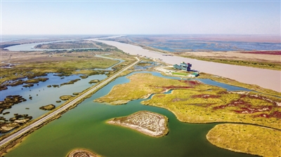 山东省东营市有近海与海岸湿地、河流湿地、湖泊湿地、沼泽湿地、人工湿地等5类14型湿地,湿地率41.58%。其中,山东黄河三角洲国家级自然保护区,是中国暖温带最广阔、最完整、最年轻的湿地生态系统。2018年,东营市被评为全球首批“国际湿地城市”。图为山东黄河三角洲国家级自然保护区景色(无人机照片)。