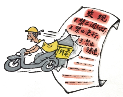 大街上,一辆辆疾驰而过的外卖电动车穿梭在行人、机动车之间,骑手们一边看手机导航,一边争分夺秒地抢时间,甚至不惜超速、逆行、闯红灯……这是记者近日在北京市多个商业区蹲点采访时看到的场景。记者采访多名骑手发现,他们不惜以身犯险,“玩命”飞驰,屡次触犯交规,一方面是为了多接单多赚钱,另一方面是为了避免超时惩罚。(11月15日《法治日报》)